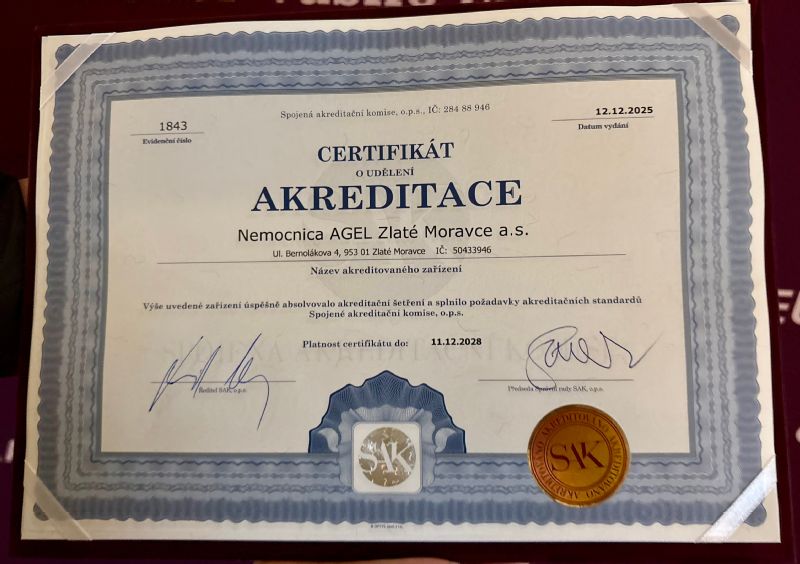 Nemocnica AGEL Zlaté Moravce potvrdila svoju pozíciu bezpečného zdravotníckeho zariadenia, keď úspešne absolvovala náročný akreditačný audit a splnila požiadavky akreditačných štandardov. Na základe toho získala prestížny certifikát o udelení Akreditácie od Spojenej akreditační komise o.p.s. (SAK). Tento úspech je o to významnejší, že v kategórii lôžkových zdravotníckych zariadení sú nemocnice patriace do siete AGEL jedinými na celom Slovensku, ktoré sa môžu pýšiť touto akreditáciou.